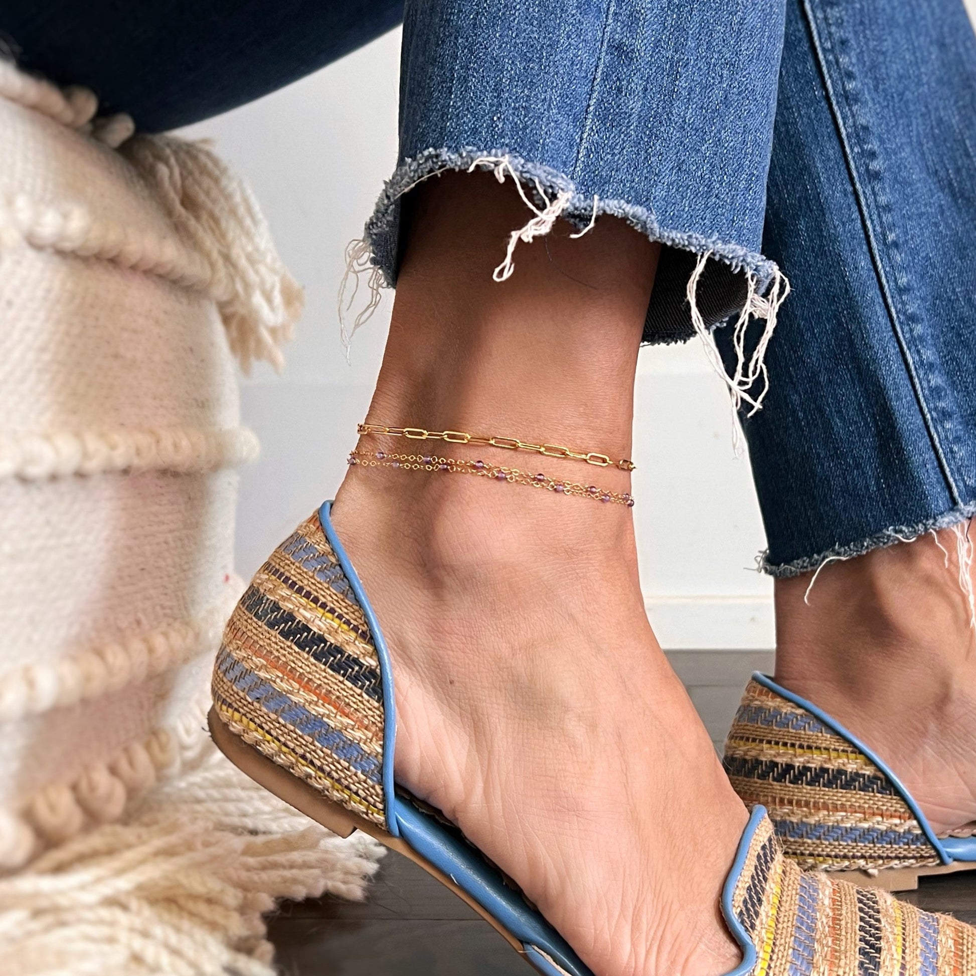 Sparkle and shine with this high quality layered anklet featuring February's colourful birthstone! Created from two strands of cable chain in either gold-filled or sterling silver materials, this anklet is adorned with natural amethyst gemstones interspersed along the chain. Tarnish and water resistant with a 1” extender for versatility, this fun accessory is sure to brighten up your days.