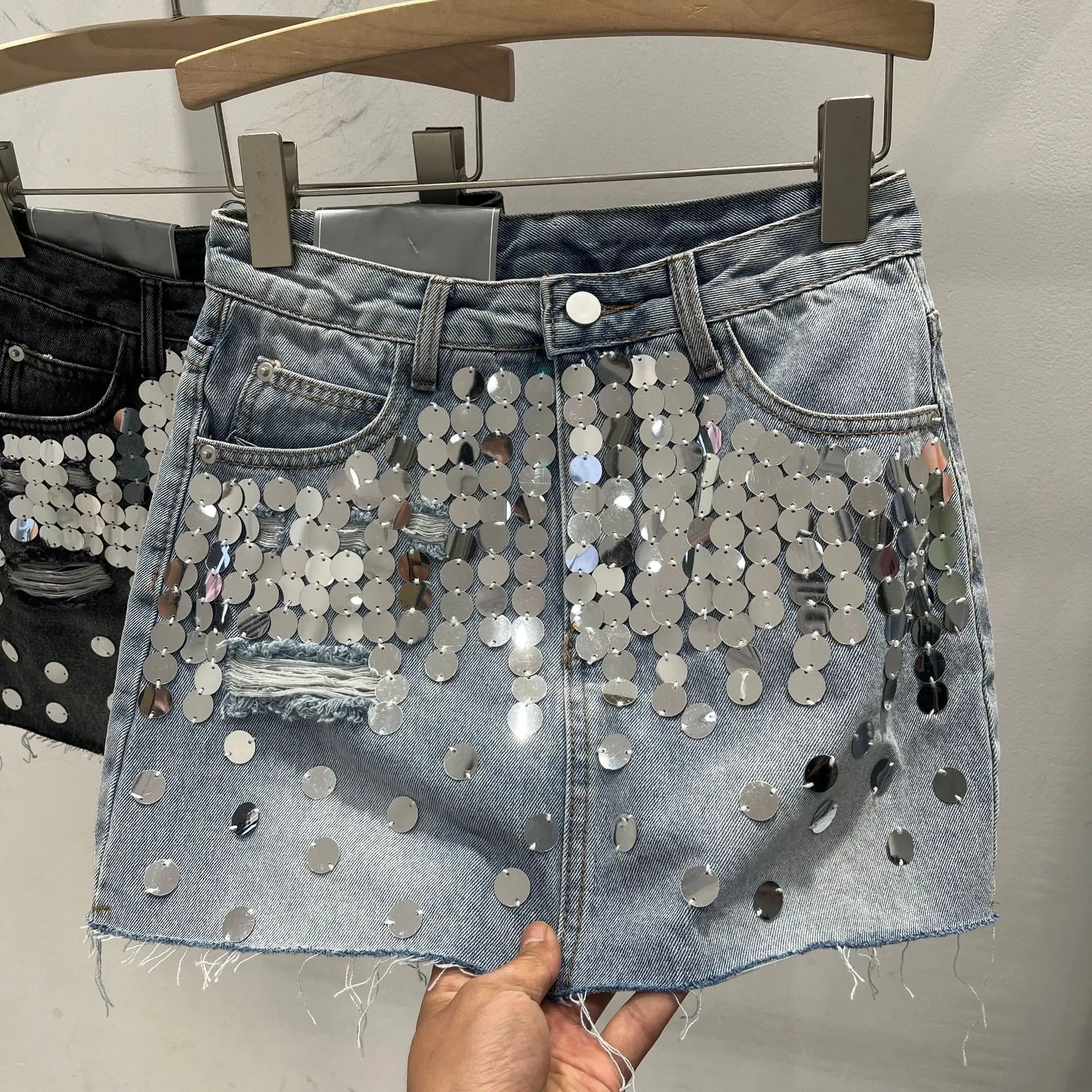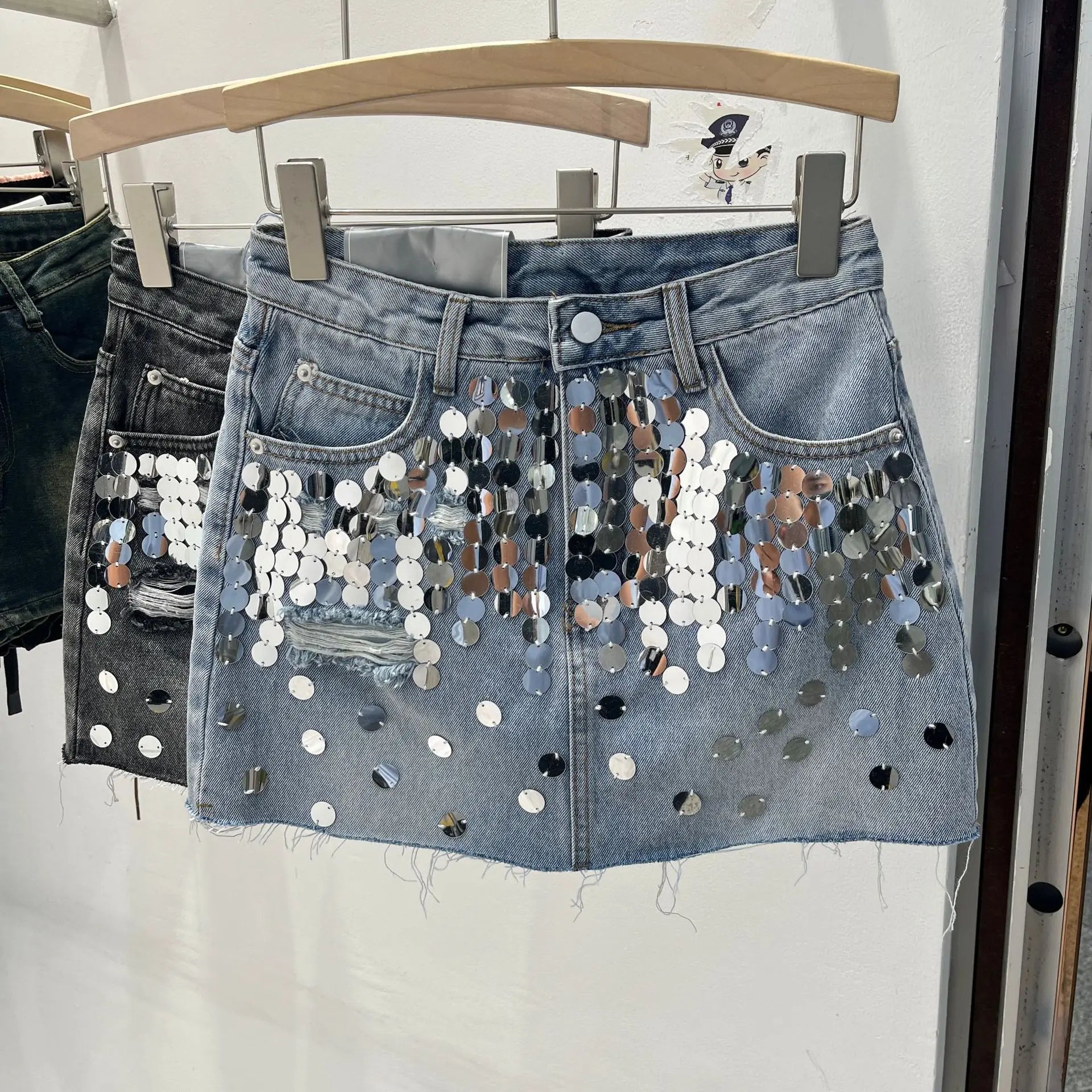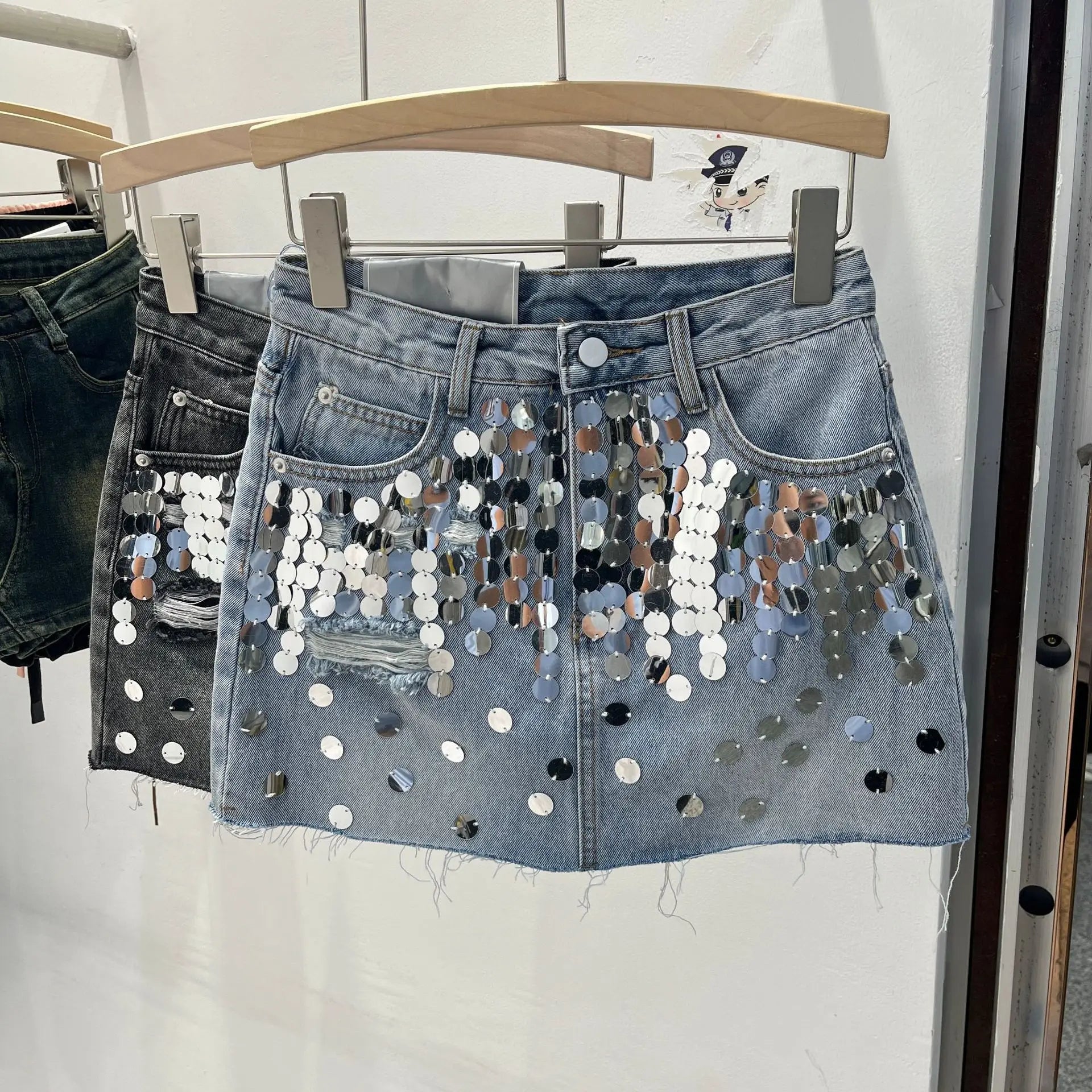 Black Skirt Korean Style Slimming Denim Skirt Women 2024 Summer New High Waist Fashionable Sequins Frayed A- Line Mini Skirts