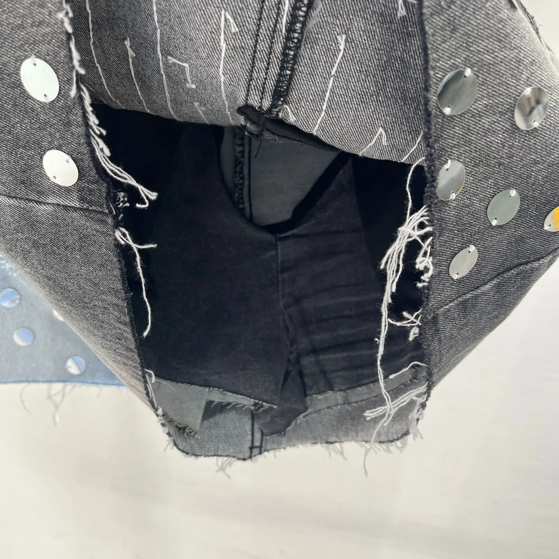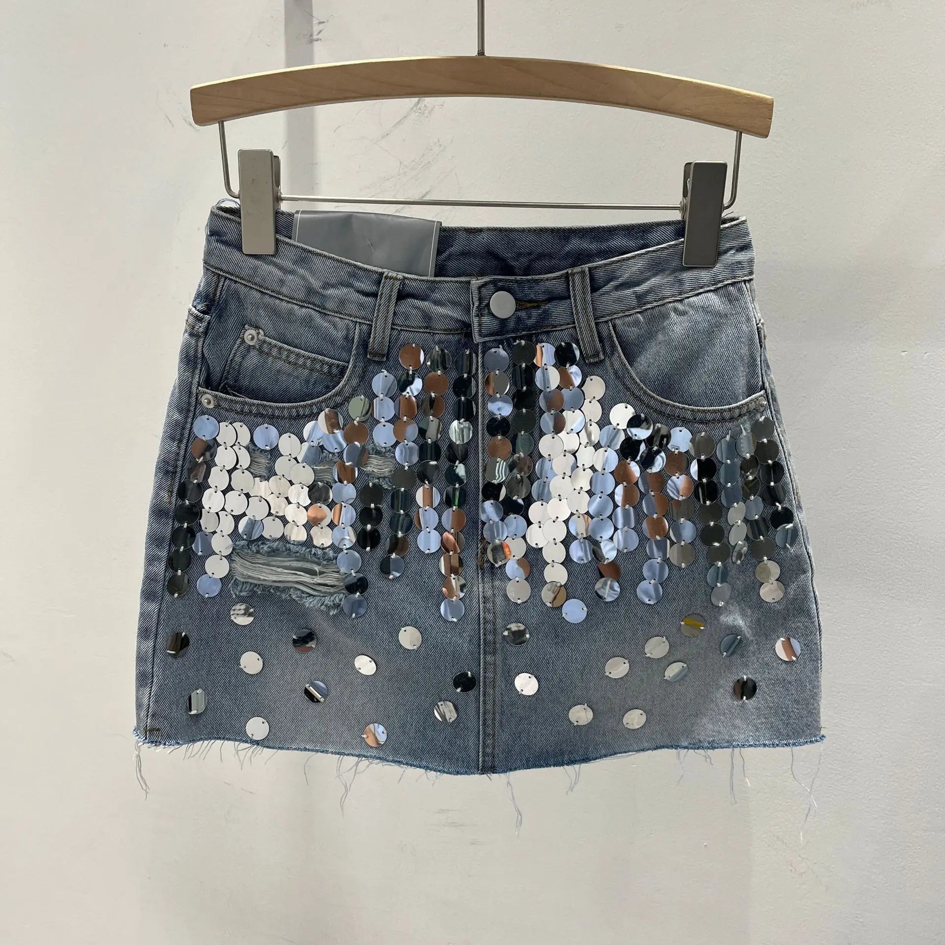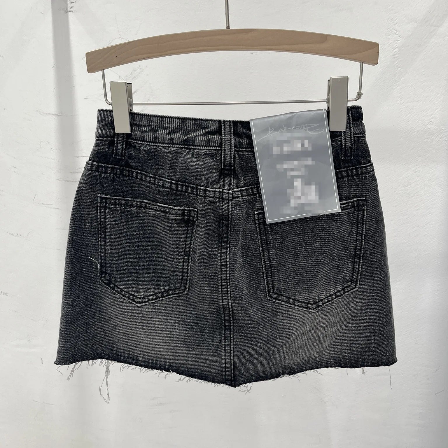 Black Skirt Korean Style Slimming Denim Skirt Women 2024 Summer New High Waist Fashionable Sequins Frayed A- Line Mini Skirts