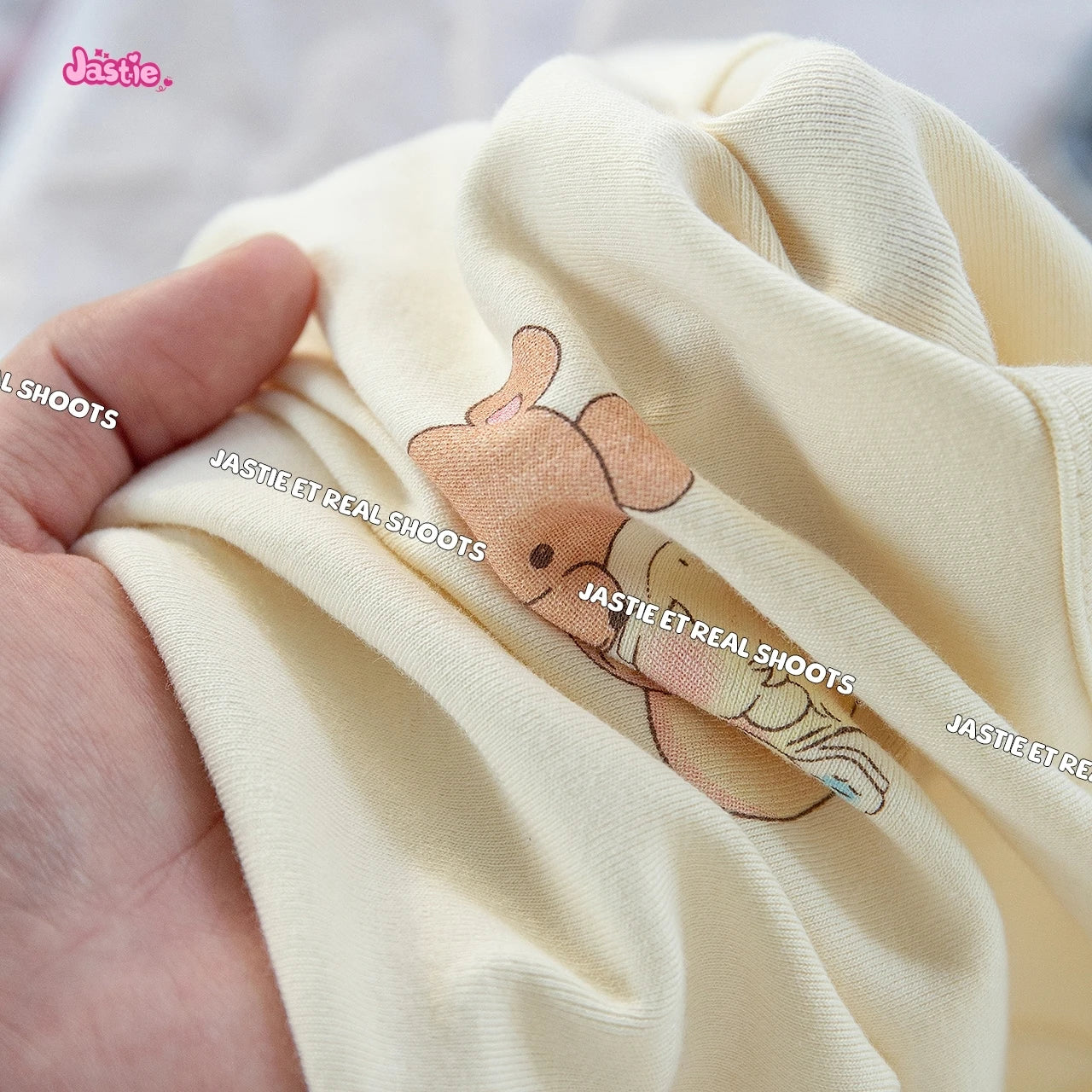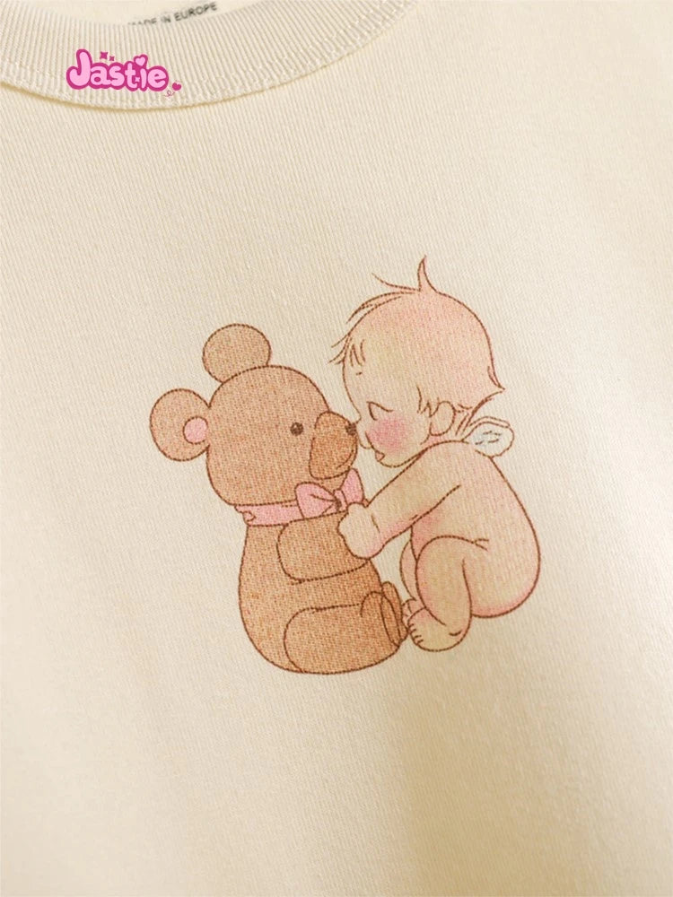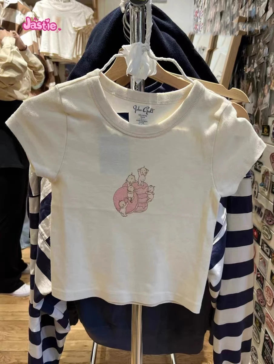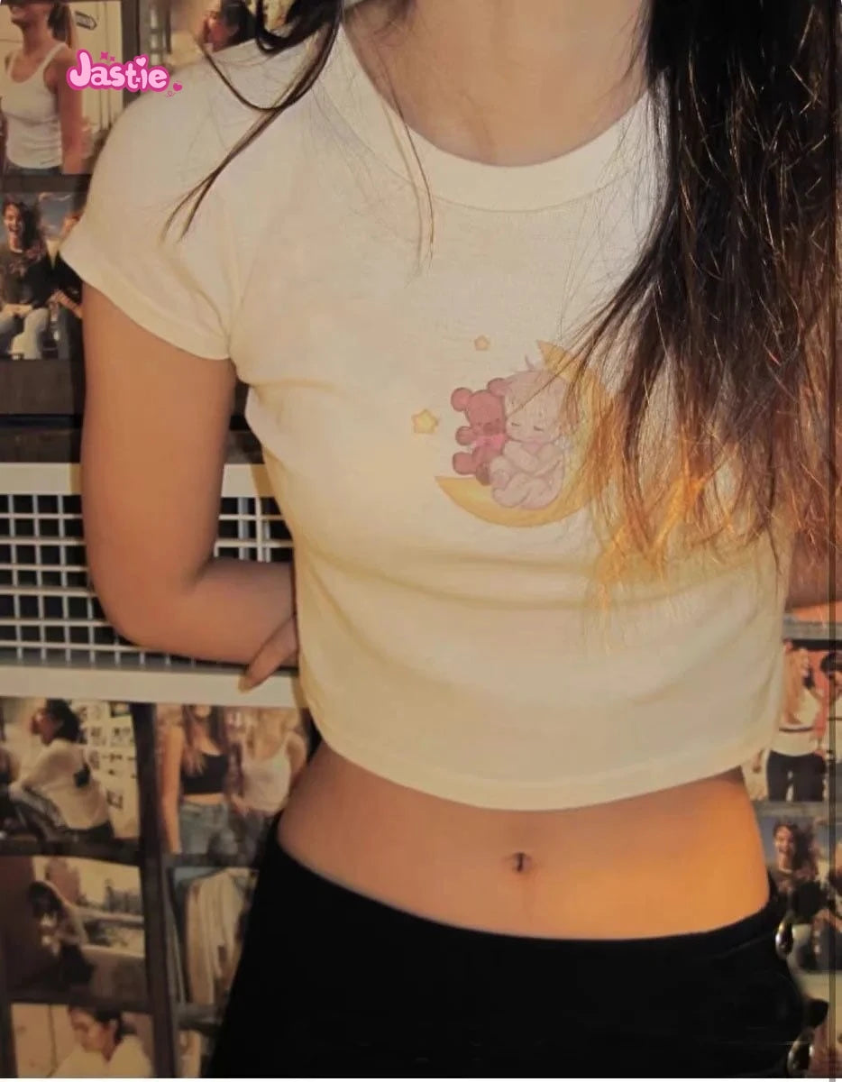 Cartoon Print Beige T-shirts Women 2024 Summer Streetwear Round Neck Short Sleeve T Shirt Female Vintage Chic Y2k Crop Top