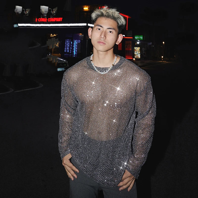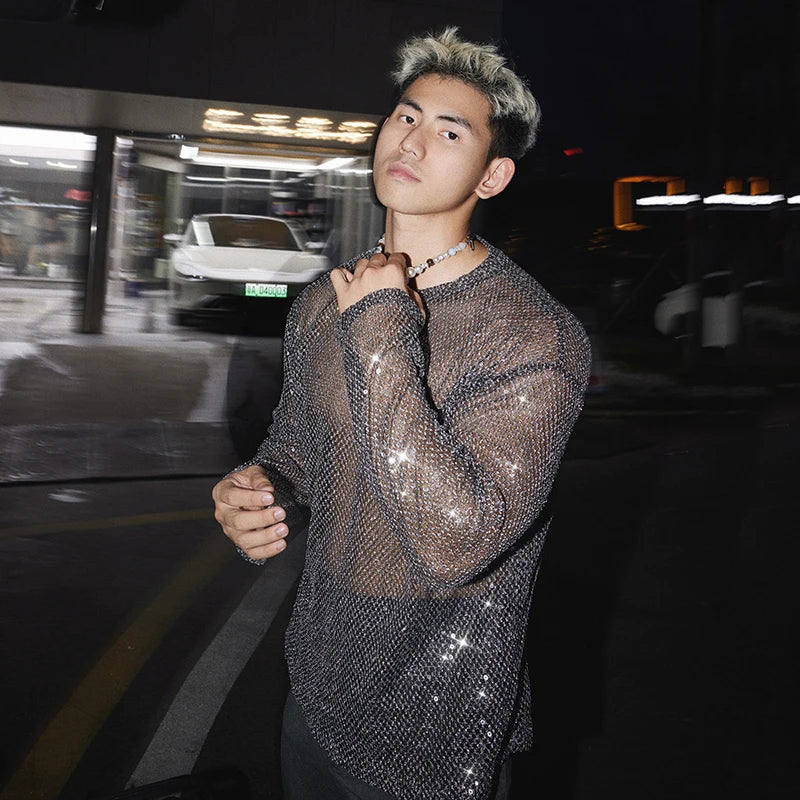 FEWQ Sequins Decoration Men's T-shirts Mesh Design Round Collar Tops Long Sleeved See-through Pullover Male Tees Niche 24K4819
