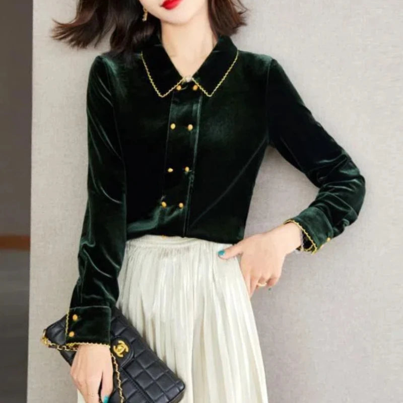 French Style Fashion Elegant Sping Velvet Shirts Women Solid Polo-Neck Single Breasted Temperament Chic Loose Long Sleeve Tops