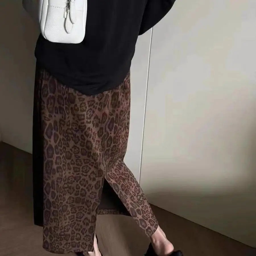 Leopard Print Midi Skirt for Women in Autumn and Winter Mid to Long, Elastic Waisted Retro Skirt All Match Long Skirt