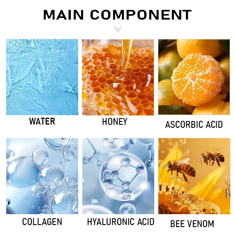 Ingredient: : Water, Bee Venom, Huuronic Acid, Collagen, Ascorbic Acid, Honey