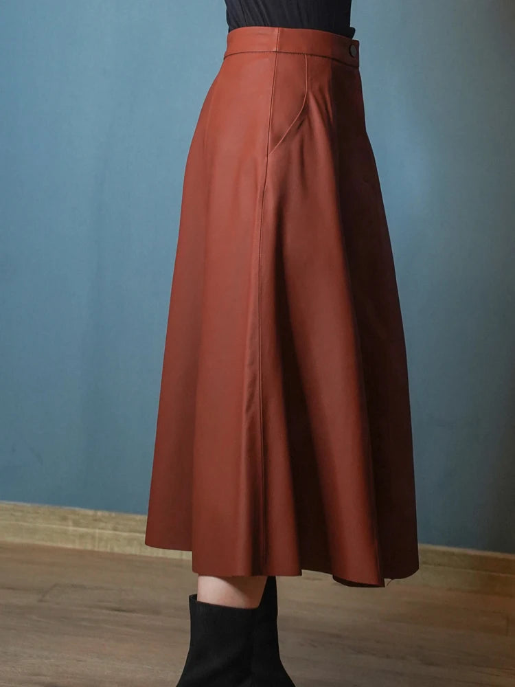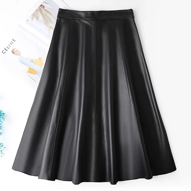 Women Caramel Genuine Leather Skirt 2025 Winter Female Natural Skin A-line Simple Big Hem Pleated Long Faldas Apricot Ropa Mujer