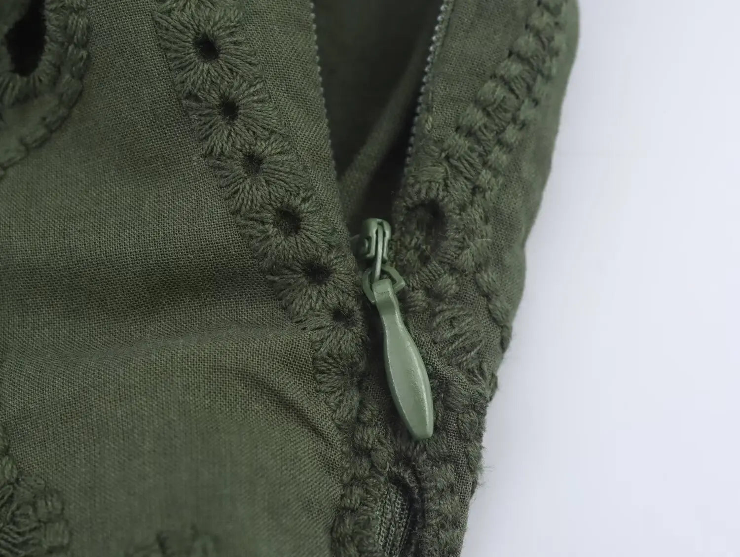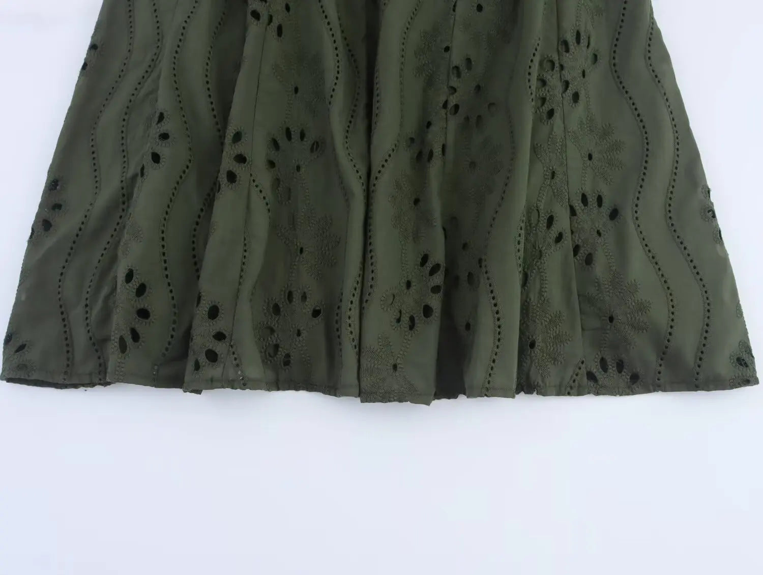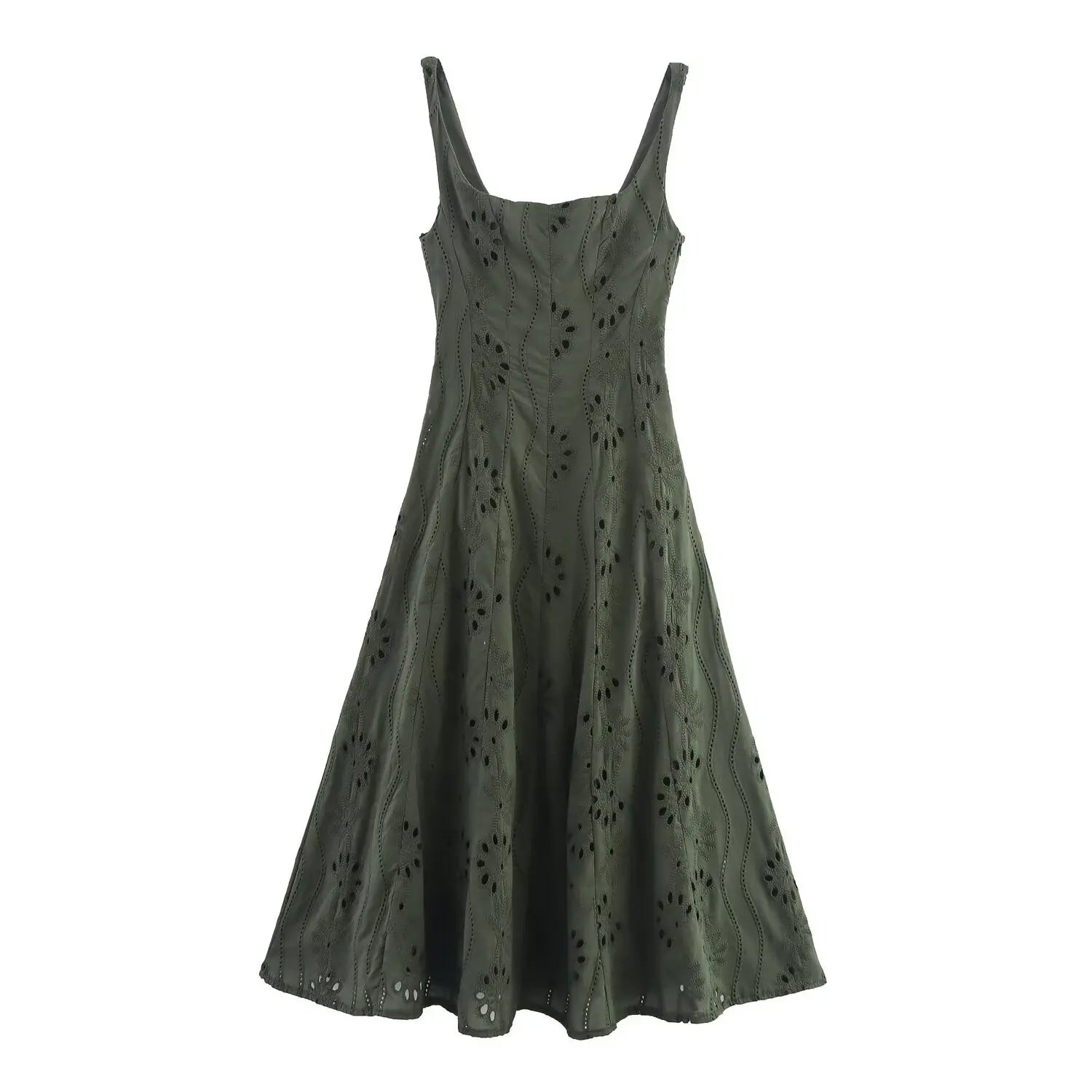 Women Embroidered Hollow A-line Dress Retro Lapel Backless Sleeveless High Waist Pleated Side Zipper Solid Color Midi Dress