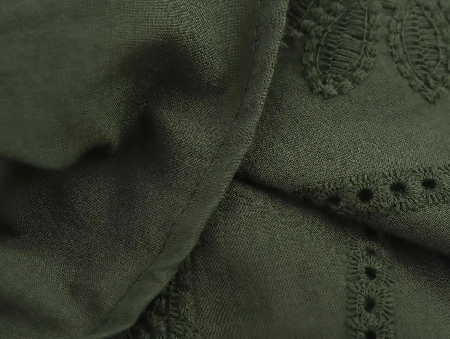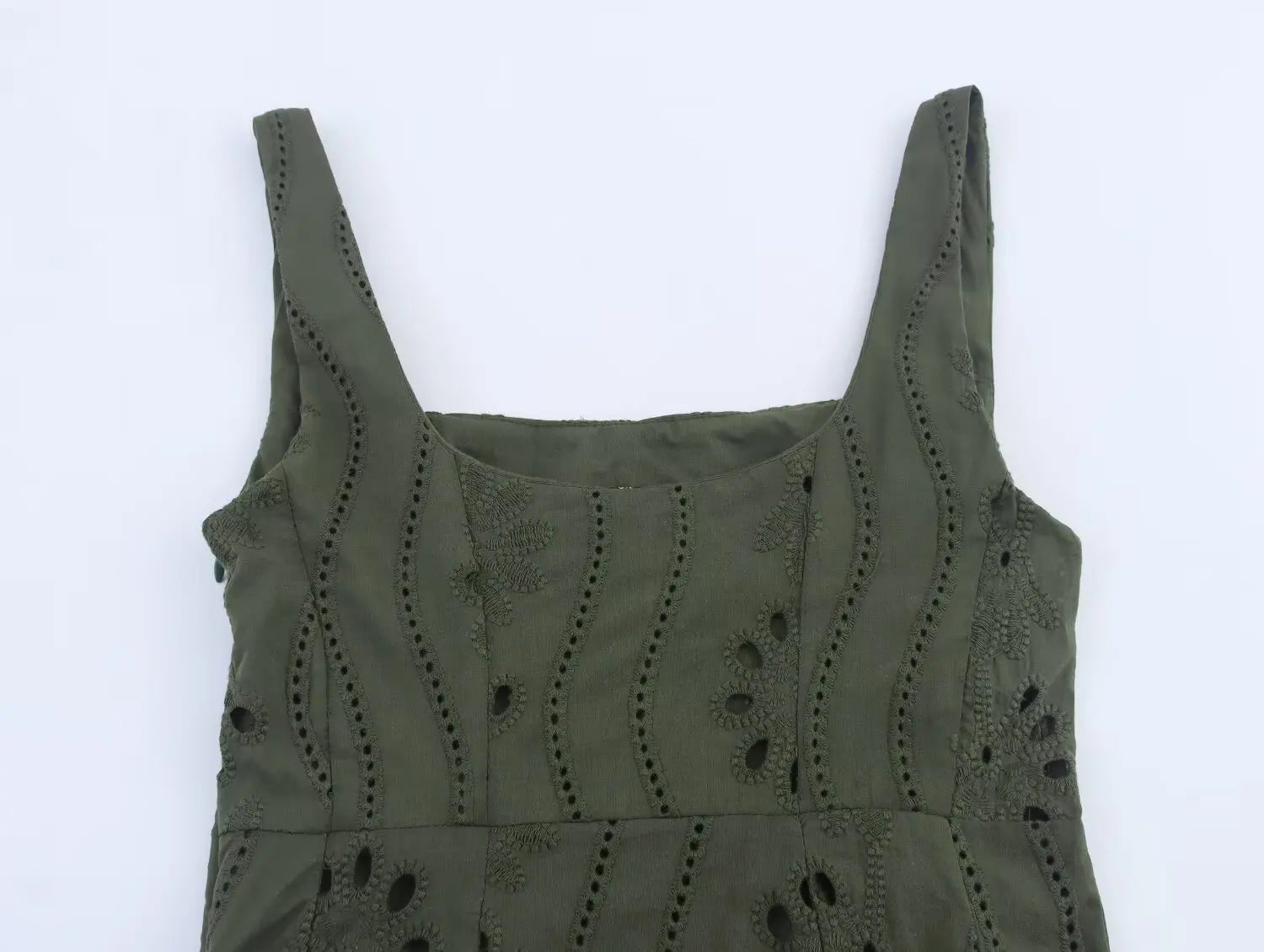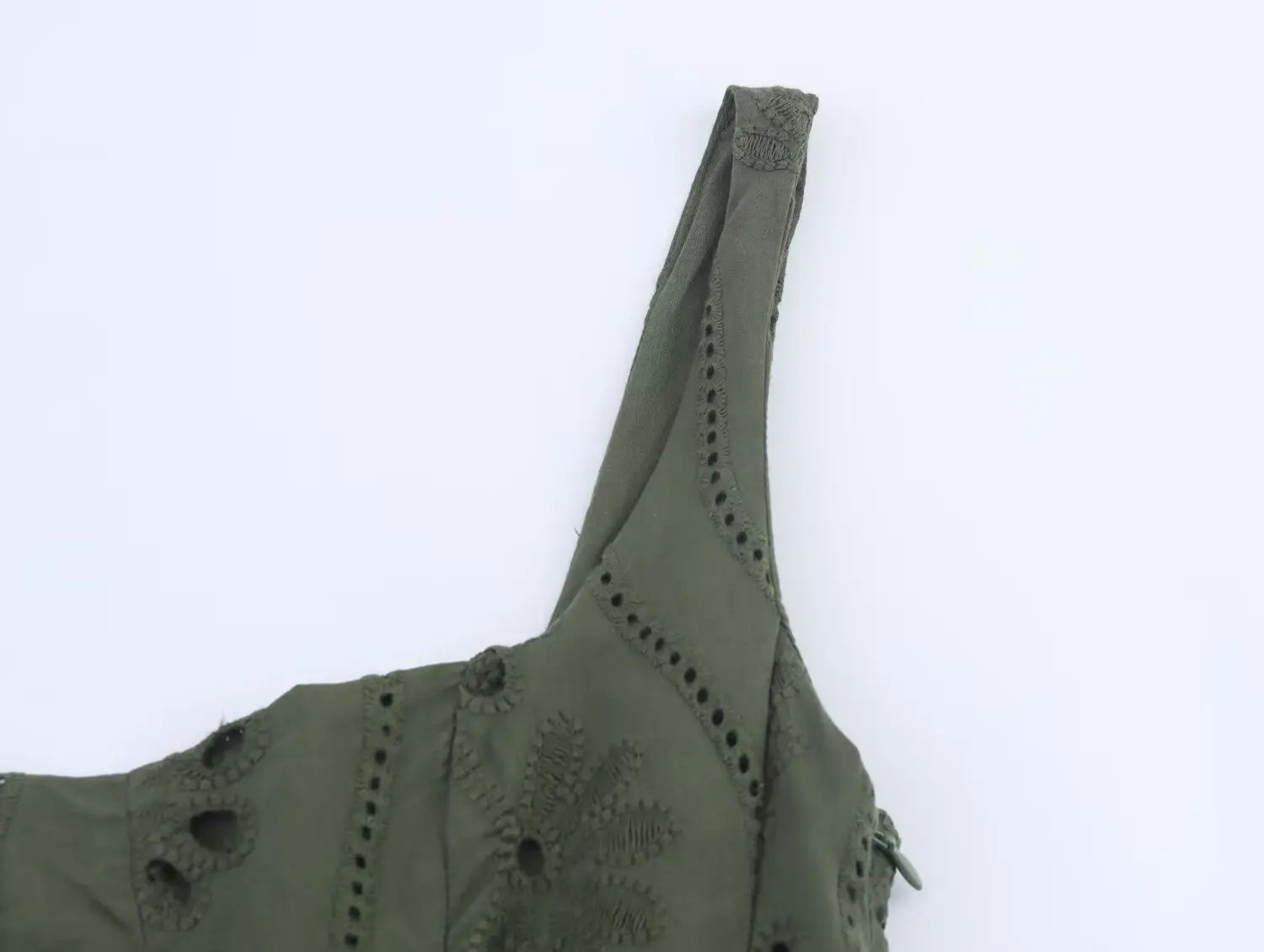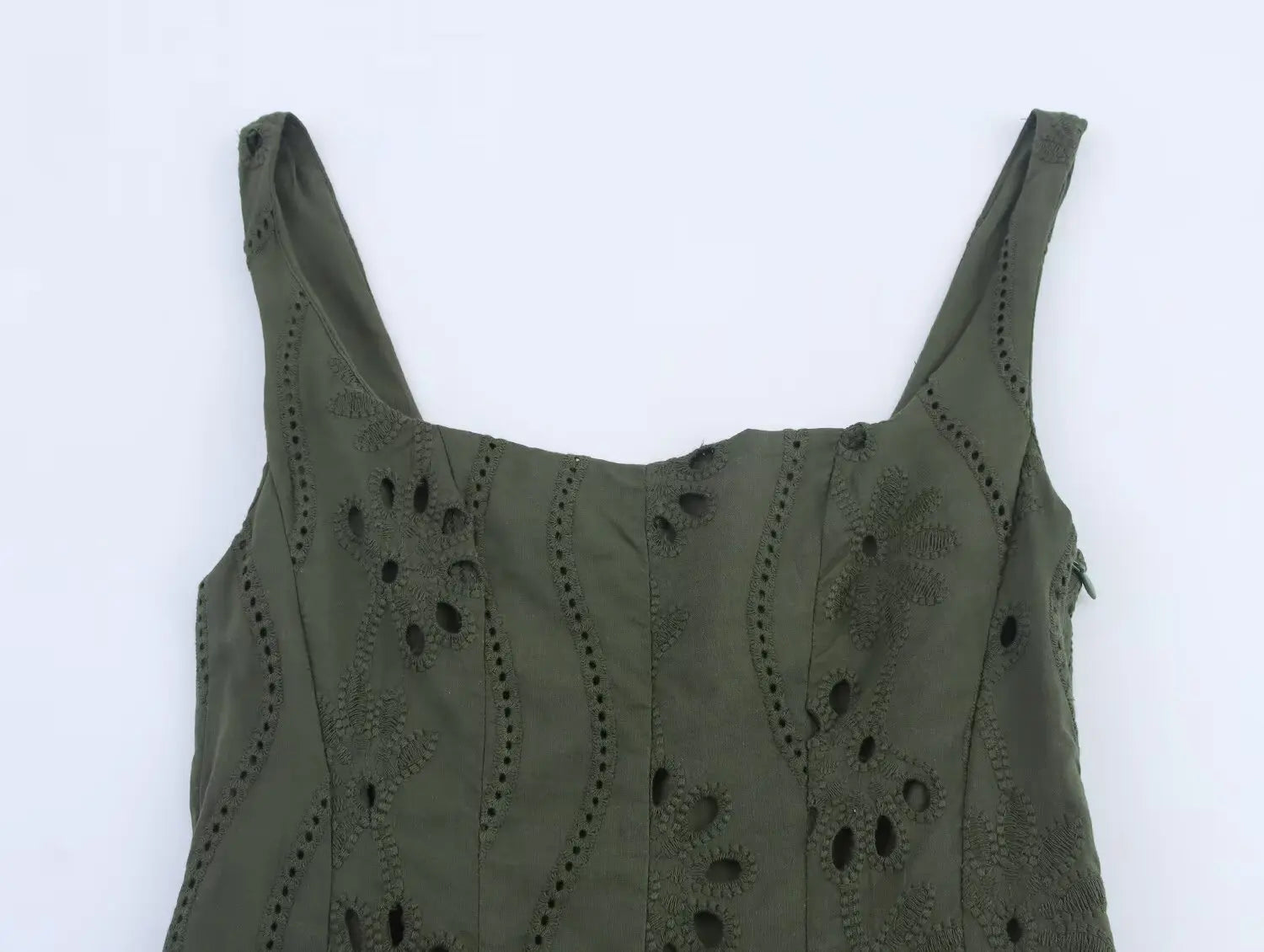 Women Embroidered Hollow A-line Dress Retro Lapel Backless Sleeveless High Waist Pleated Side Zipper Solid Color Midi Dress