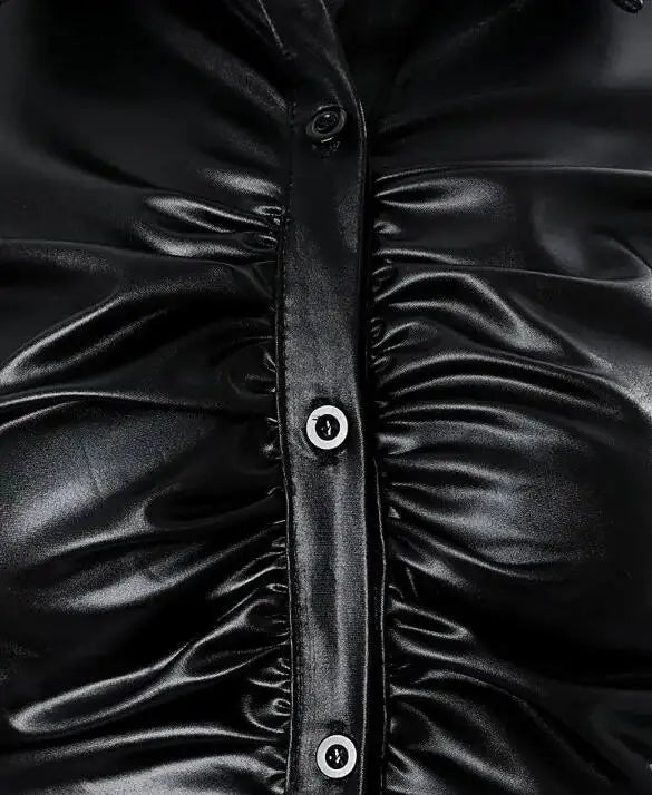 Women's Faux Leather Button Front Shirt with Ruched Lapel Collar Stylish and Comfortable Long Sleeve Top