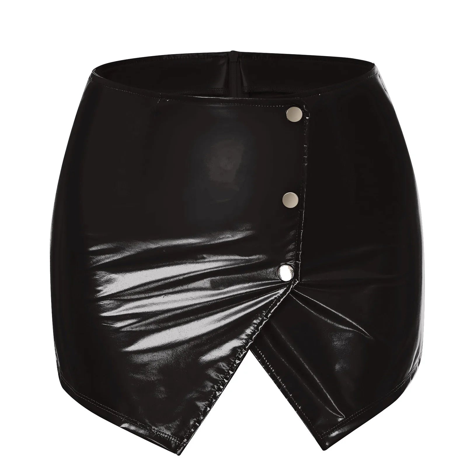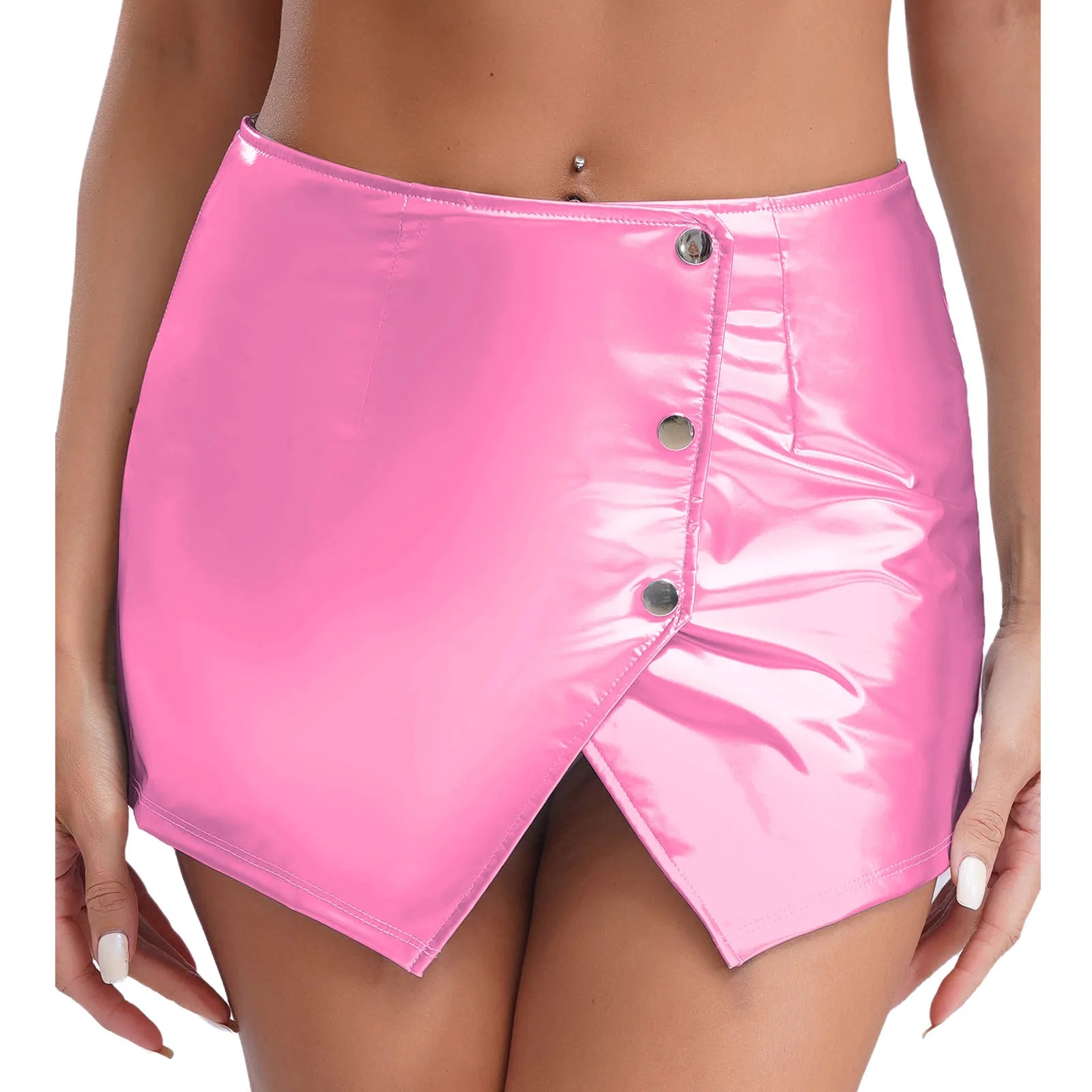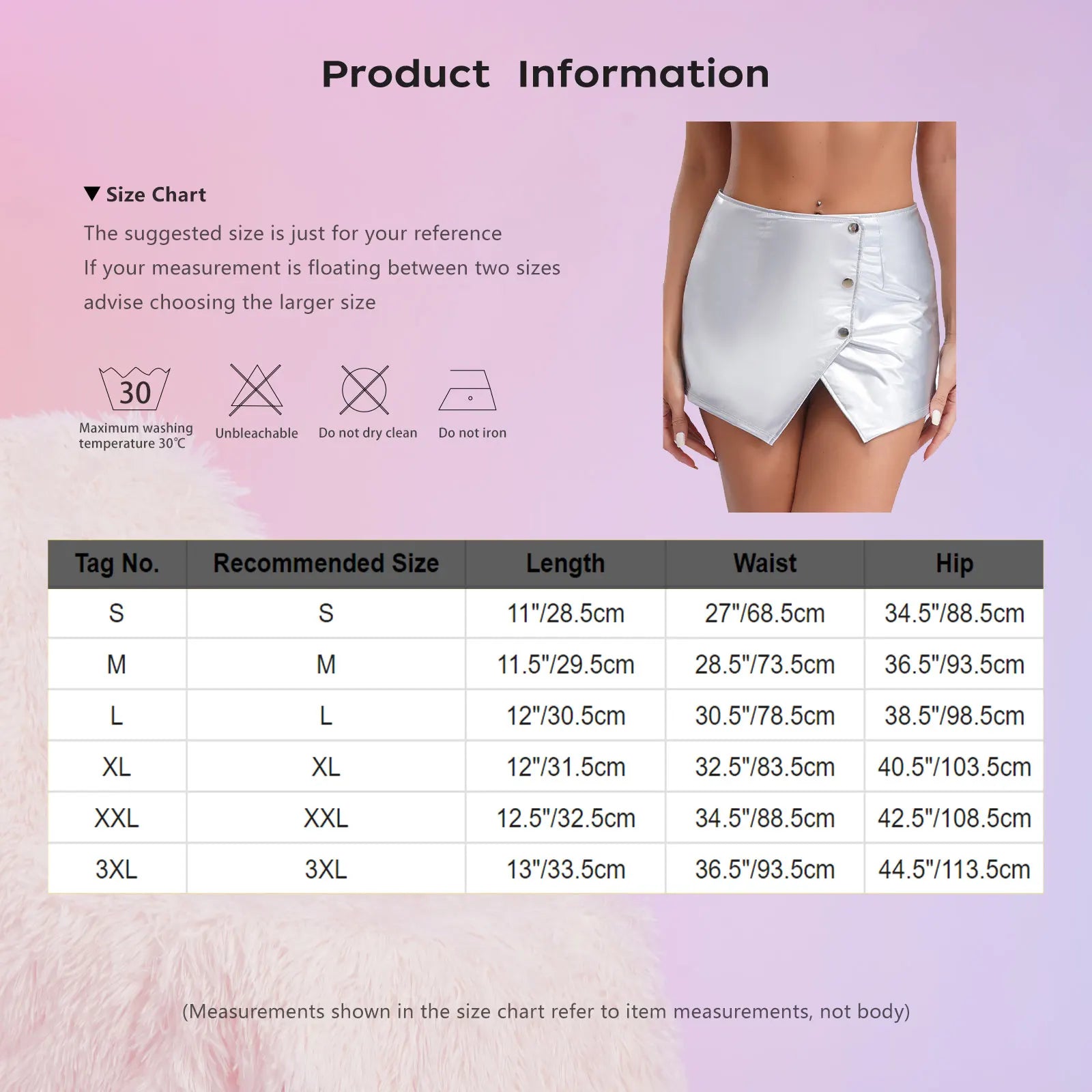Womens Metallic Sexy Front Split Latex Mini Skirt Shiny Short Skirt Bar Clubwear Holographic Buttons Back Zipper Club Skirts